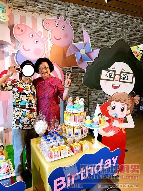 於是我們專業的佈置團隊,就針對爸爸提供的阿嬤照片,畫出了一個阿嬤抱著阿琁的Q版畫像,並且輸出成人形立板!真的超級厲害的呢!做出來就呈現下面這個樣子。
